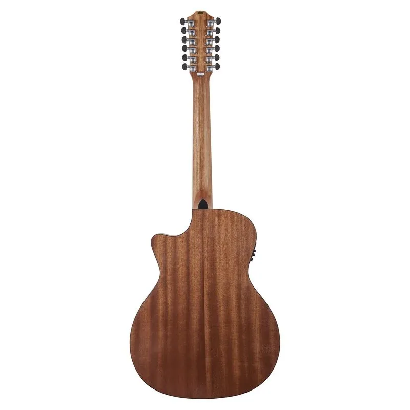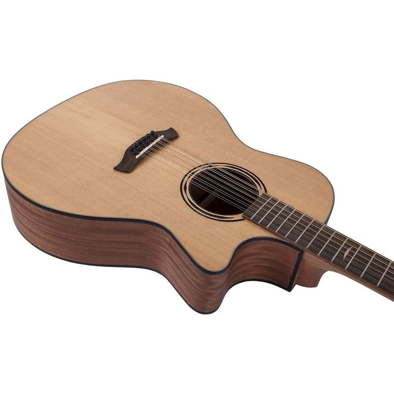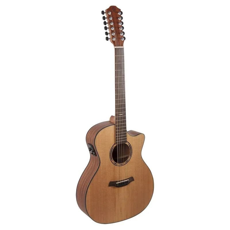 BATON ROUGE AR11C/ACE-12 – 12-струнная электроакустическая гитара Auditorium с катавеем. Она обладает массивной верхней декой из канадского кедра, а нижняя дека и стороны сделаны из красного дерева, как и гриф. Накладка на гриф и бридж выполнены из ованкола. У гитары 20 ладов. Верхний и нижний порожек сделаны из материала Nubone, который похож тональными характеристиками на материал TUSQ. NuBone гасит вибрацию струн, передает оптимальные частоты для гитары, что позволяет иметь больше гармоник, а также лучшие объем и тон. Ширина верхнего порожка – 43 мм, нижнего – 48 мм.